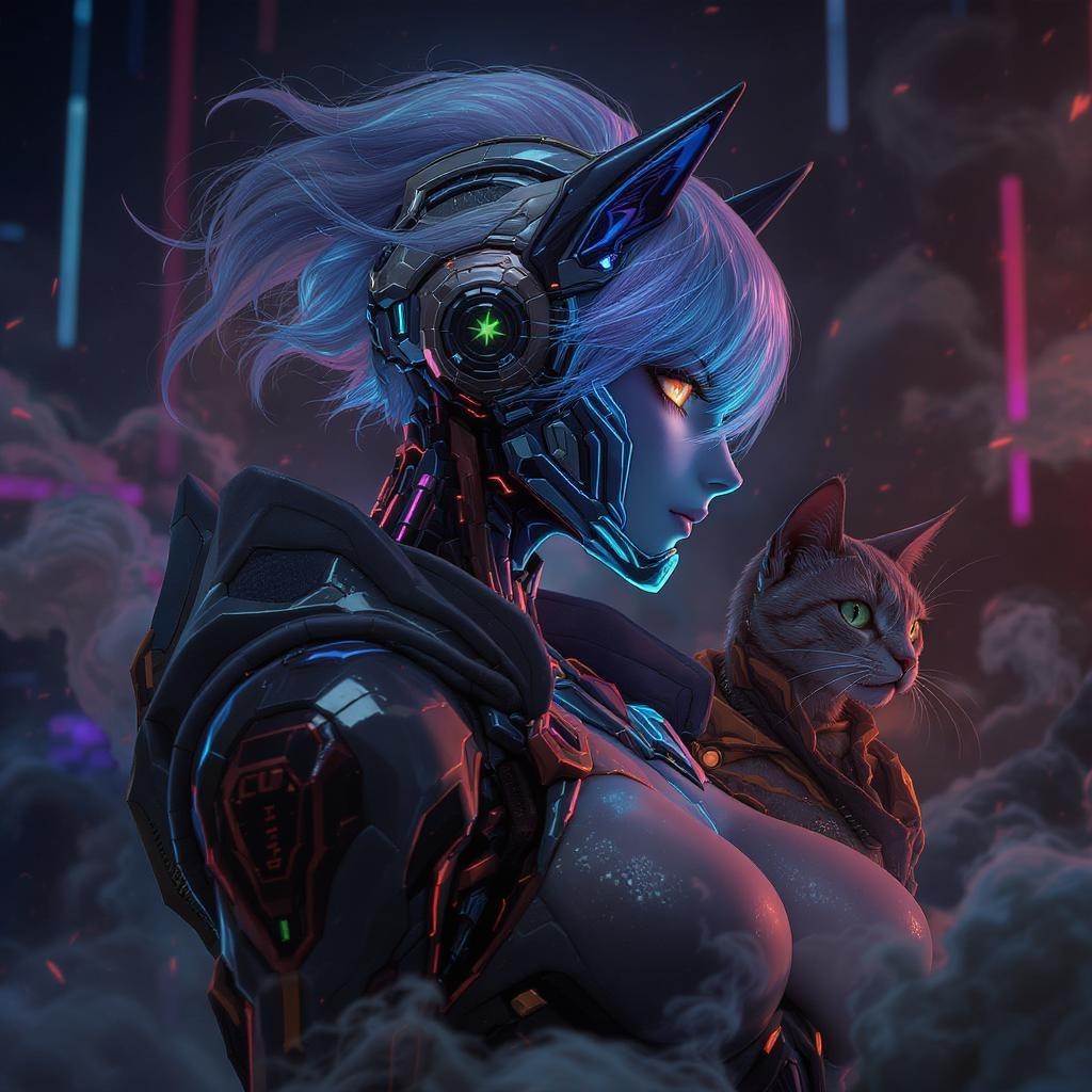dreamlikeart, digital painting, anime-inspired portrait of a futuristic military cyborg in a cyberpunk setting, featuring a sleek armored cat companion, warframe design with stealth elements, adorned with neon lights and swirling smoke, character design emphasizes hard surface armor and smooth, highly detailed textures, face depicted with intricate symmetrical details, volumetric and ambient lighting creating a dynamic scene, real-time visual effects, ultra high definition rendering, shot in HDR 3D, capturing a side profile with expressive features, avoiding poorly composed elements like long necks or cropped heads, maintaining anatomical harmony and beauty.