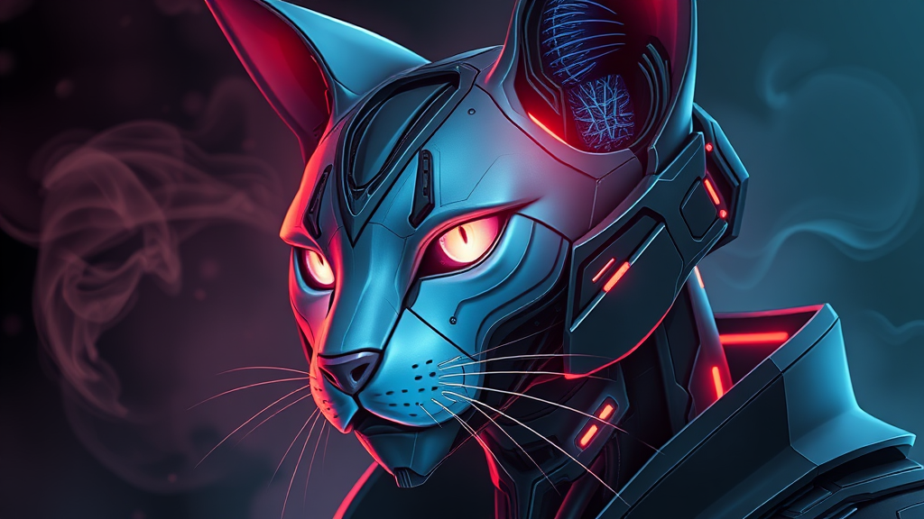 dreamlikeart digital painting anime portrait of futuristic military cyborg cyberpunk cat warframe stealth armored neon lights smoke character design hard surface smooth detailed face highly detailed intricate symmetrical volumetric lighting ambient lighting real-time vfx uhd hdr 3d side profile mouth ears extending beyond frame unique anatomy elongated neck partially cropped head