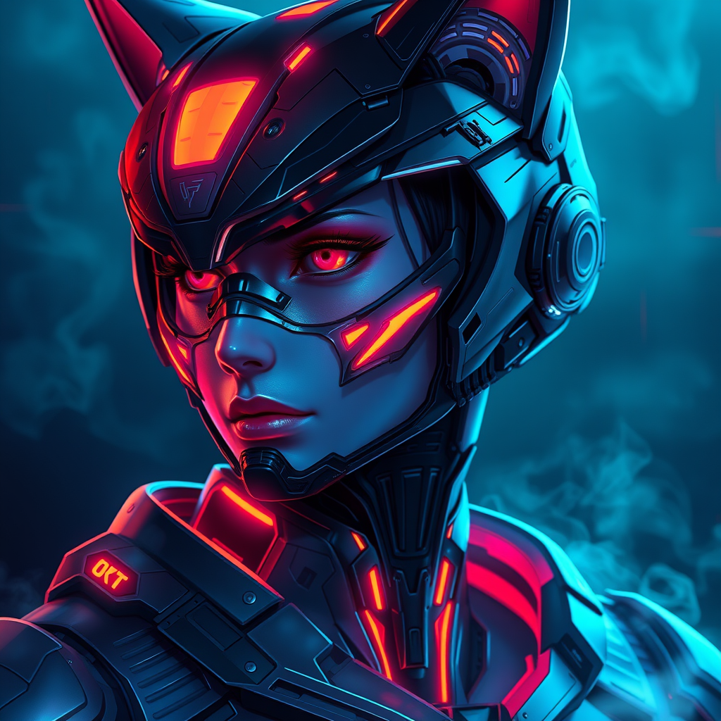 Dreamlikeart digital painting anime style portrait of a futuristic military cyborg combining elements of cyberpunk and a cat-like warframe; the design features stealthy armored aesthetics illuminated by vibrant neon lights and soft smoke. The character showcases an intricate hard surface design highlighting a smooth, highly detailed face with symmetrical features and volumetric ambient lighting. Created with an emphasis on real-time VFX, the scene is depicted in UHD HDR 3D with a focus on a side profile, carefully avoiding common pitfalls such as bad proportions, poor anatomy, or deformed elements. The neck is elegantly elongated, adding to the character's unique appearance, while maintaining an air of mystique and intrigue.