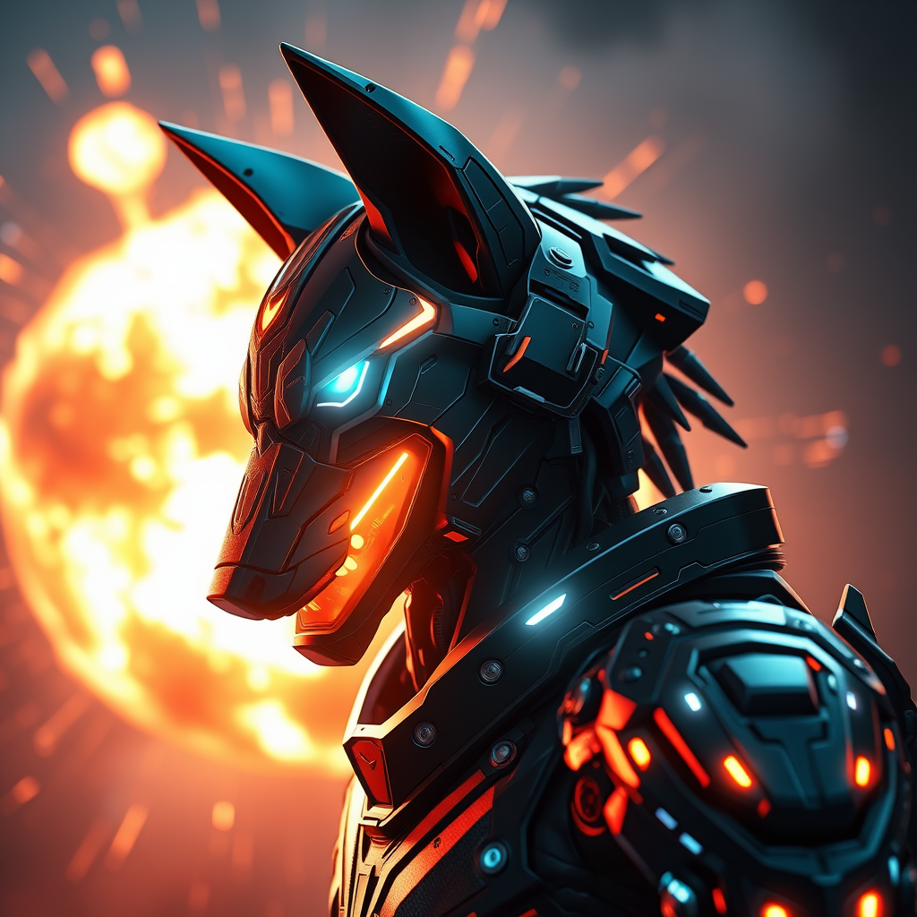 Dreamlikeart-inspired 3d render of a futuristic military cyborg wolf with a cyberpunk warframe design, showcasing stealthy, armored features highlighted by bright neon lights. An explosion dramatically illuminates the background, emphasizing the character's detailed face and intricate, symmetrical design. The scene incorporates hard surface textures seamlessly blending with smooth lines, all bathed in volumetric and ambient lighting for a real-time vfx effect. The character, captured in a digital 3d uhd hdr side profile, pushing the boundaries with unique yet harmonious anatomy, with elongated ears and futuristic elements. The design accentuates an elegant fusion of realism with digital painting aesthetics, avoiding unnecessary visual clutter or exaggerated features.
