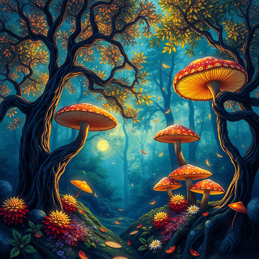 Dreamlikeart, Masterpiece, enchanted woodland painting, magical illumination, vibrant hues, tree-like mushrooms, soft glow, intricately detailed, enhanced with Unreal Engine 5, inspired by Vincent Van Gogh, UHD, HDR, 16K model. Minimize 2DN jpeg artifacts, avoid low quality, low resolution, exclude text, watermarks, logos, signatures, usernames, words, maintain clarity, full frame, eliminate duplicates.