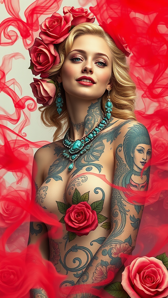dreamlikeart young joyful blonde girl cosmic dress magnificent stunning full-body tattoos ornate rococo art nouveau turquoise jewelry enveloped in red smoke surrounded by roses hypermaximalist elegant vintage hyper realistic meticulously detailed pastel colors UHD HDR10 absurdres model 2DN exclude flaws like duplications disfigurements mutations deformations cloned features cross eyes elongated neck extra appendages ensure clarity avoid low-resolution out of frame blurriness jpeg artifacts watermarks logos text cropped sections or cartoonish split images