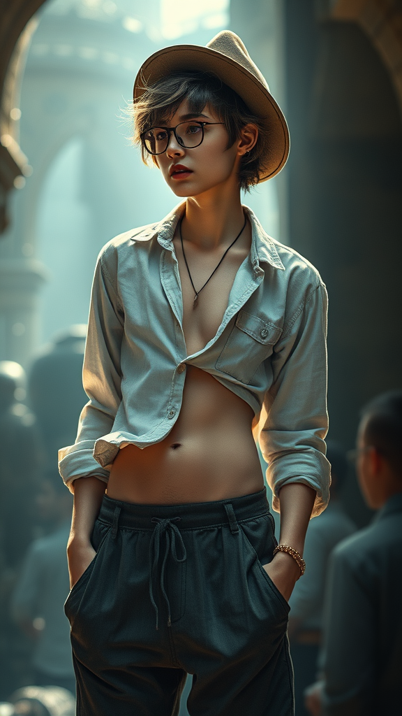 dreamscape enchanting young, slender, athletic, short tousled hair, elaborate details, loose-fitting trousers, casual shirt, glasses, hat, exposed midriff, navel piercing, Stylish Posture, DSLR, F/2.8, Light Glare, 5D, 16k, High-Resolution, surreal, otherworldly, ethereal, enigmatic, fantastical, intricately realistic, solid, everyday, regular, unappealingXLv1