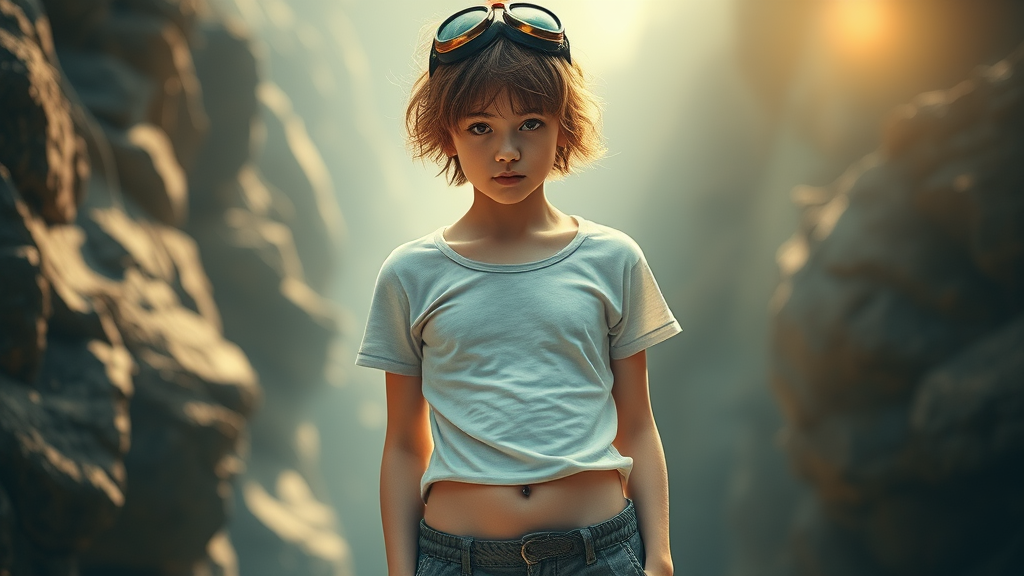 dreamscape enchanting young, slender, athletic, tousled short hair, intricate detailing, loose pants, casual t-shirt, goggles perched on a cap, hint of midriff with bellybutton piercing, striking fashion stance, DSLR clarity, F/2.8 depth, lens flare effect, 5D camera quality, ultra-resolution 16k, mesmerizingly surreal, ethereal ambiance, dreamy, mysterious, fantastical yet realistic, merging the extraordinary with the mundane, slightly altered to retain core essence yet introduce unique twists.