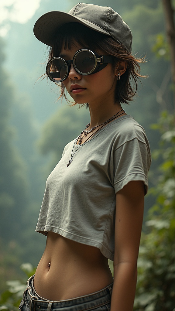 View this AI-generated image featuring dreamscape scene featuring a beautiful young individual with a thin fit physique and short tousled hair they wear baggy pants and a stylish t shirt combined with goggles and a cap perched atop their head a subtle midriff reveals a bellybutton piercing striking