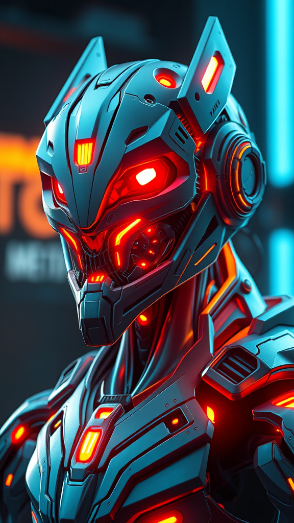 dreamscapeart futuristic military cyborg 3d render cyberpunk warframe stealth armored neon glow character creation hard surface polished detailed visage hyper-detailed intricate features symmetrical volumetric illumination ambient glow real-time visual effects digital 3d ultra-high-definition high dynamic range mouth ears openings distorted proportions flawed anatomy peculiar long neck abstract cartoonish anime-inspired digital illustration