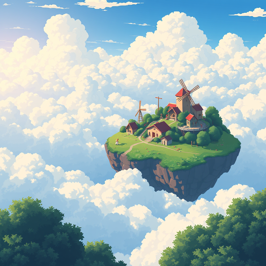 Dreamy 16-bit pixel art scene depicting a whimsical island floating amidst a sea of fluffy clouds, inspired by the enchanting style of Studio Ghibli, capturing a cinematic still with rich, vibrant colors and high dynamic range lighting, where a quaint village tops the island, with tiny windmills turning slowly in the gentle breeze and lush greenery creating a serene, magical atmosphere.