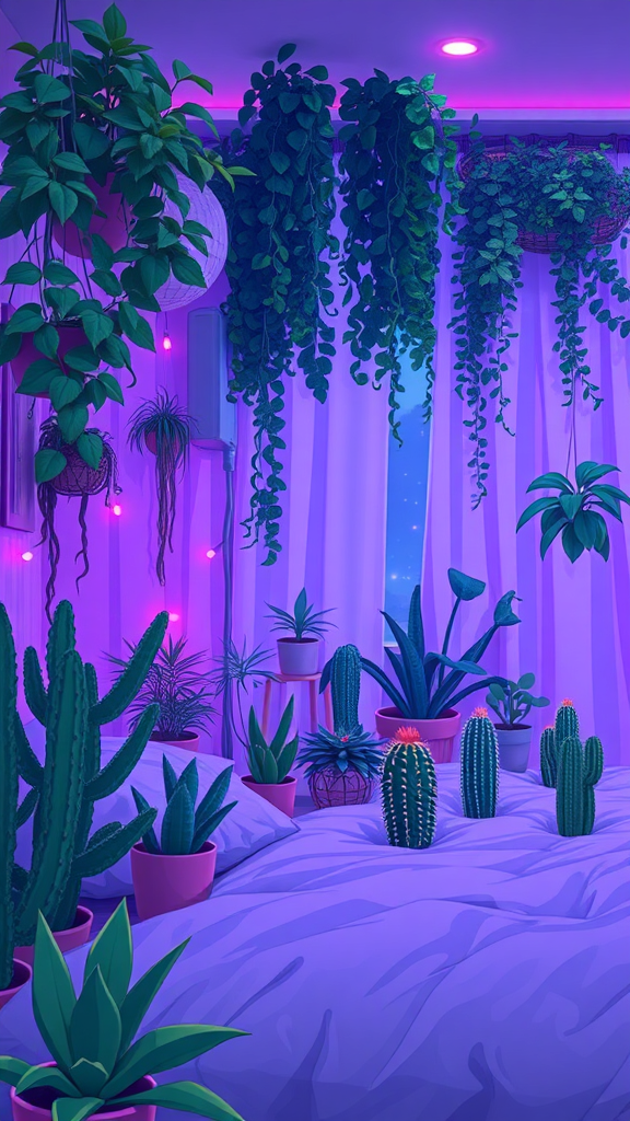 Dreamy anime-inspired bedroom adorned with an array of lush plants and adorable cacti, bathed in a gentle glow of soft purple lights that cast a magical, whimsical ambiance perfect for a serene night.