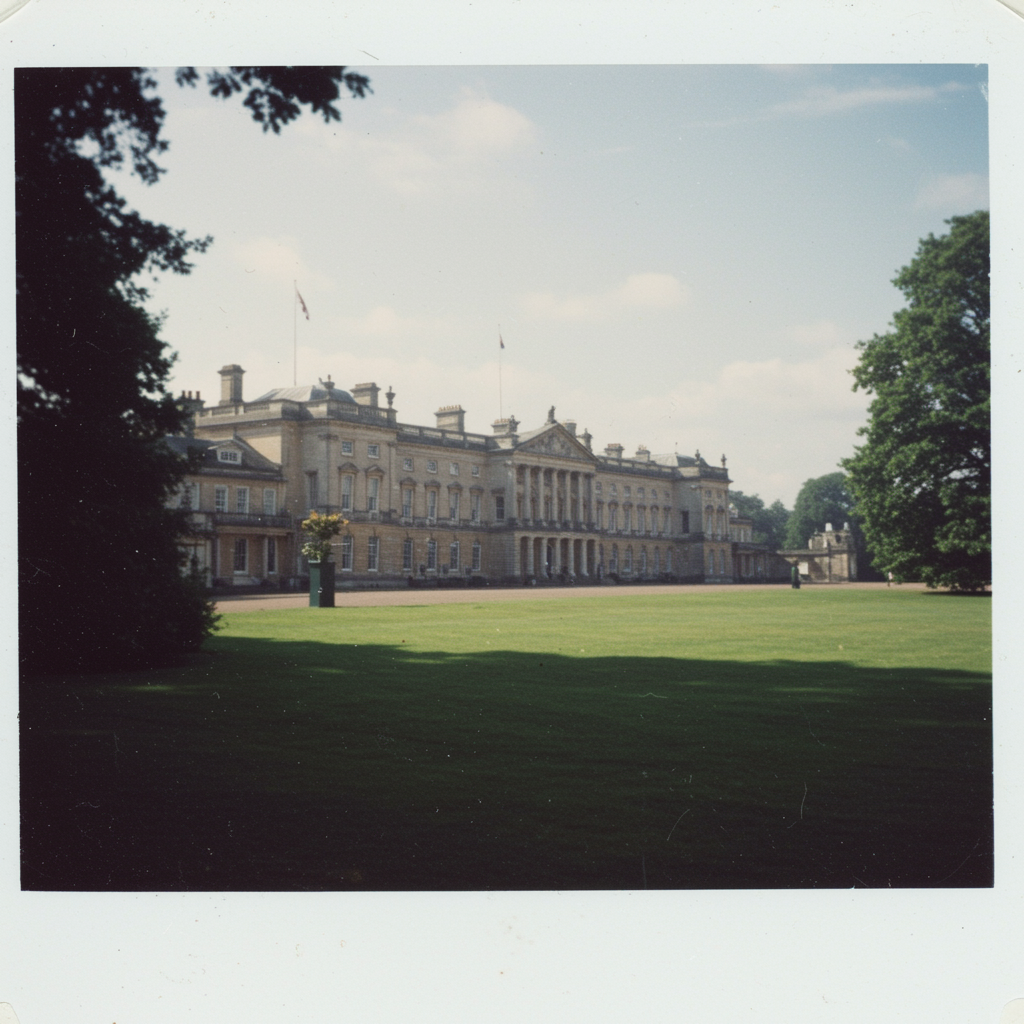 Dreamy disposable photo capturing the ethereal essence of a UK palace, soft focus with subtle light leaks, evoking a sense of nostalgia.