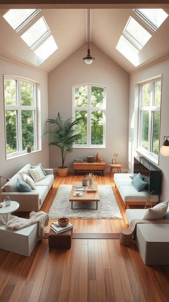 Dreamy high-resolution photograph of a sunken living room conversation pit featuring a warm wooden floor, modest windows offering glimpses of the lush garden outside. The room is adorned with Bauhaus-inspired furniture and decor, elegantly arranged under a lofty ceiling. The color palette embraces soothing beige, serene blue, and gentle salmon pastels, creating a tranquil and inviting environment. The layout evokes the pages of a high-end interior design magazine, capturing a cozy and intimate atmosphere enveloped in natural light.