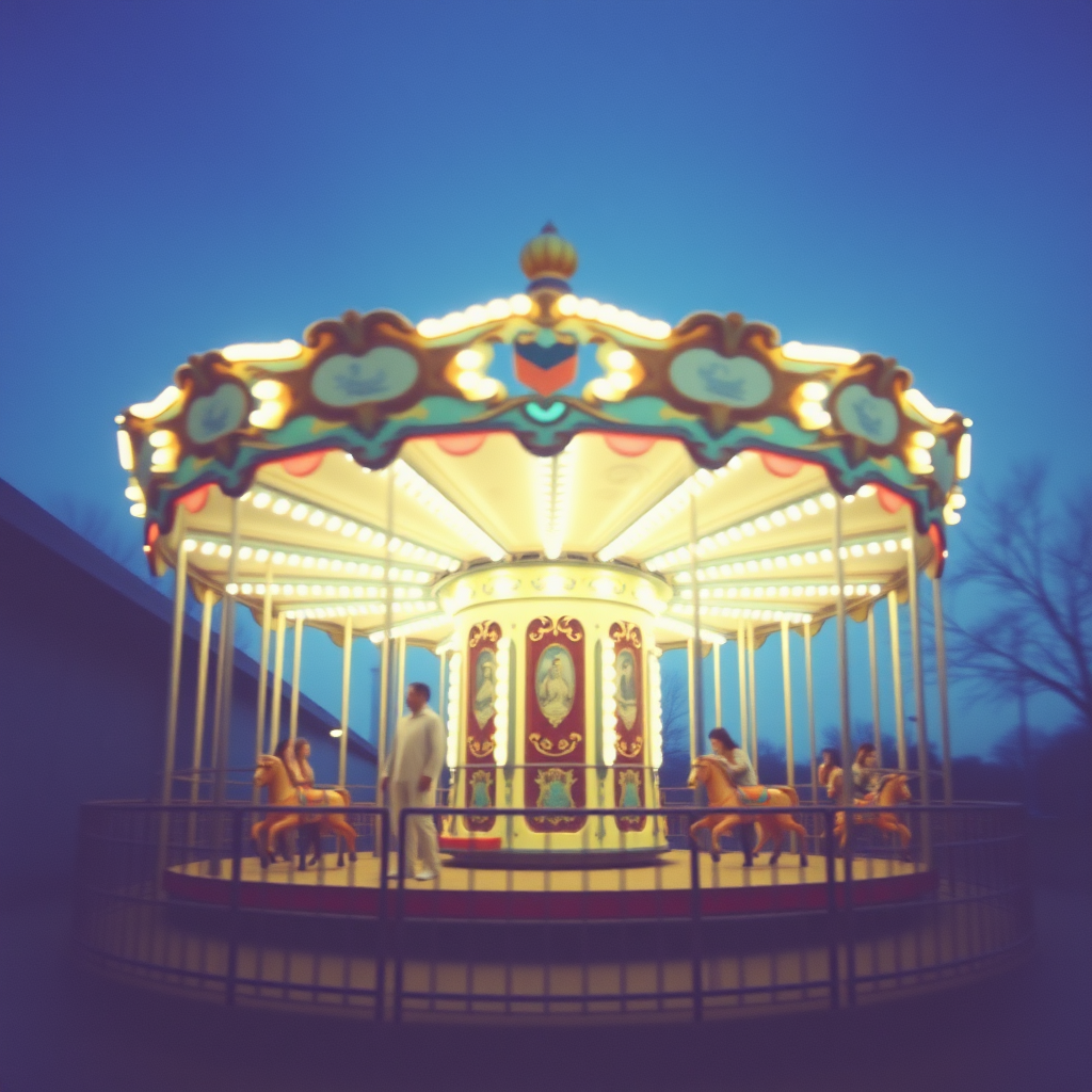 Dreamy Kodak-inspired photograph of a merry-go-round captures a modern, minimalist aesthetic with a soft Instagram-like mood, showcasing high-resolution 8k quality, aspect ratio 4:3, slightly blurred pastel hues creating a nostalgic yet contemporary feel.