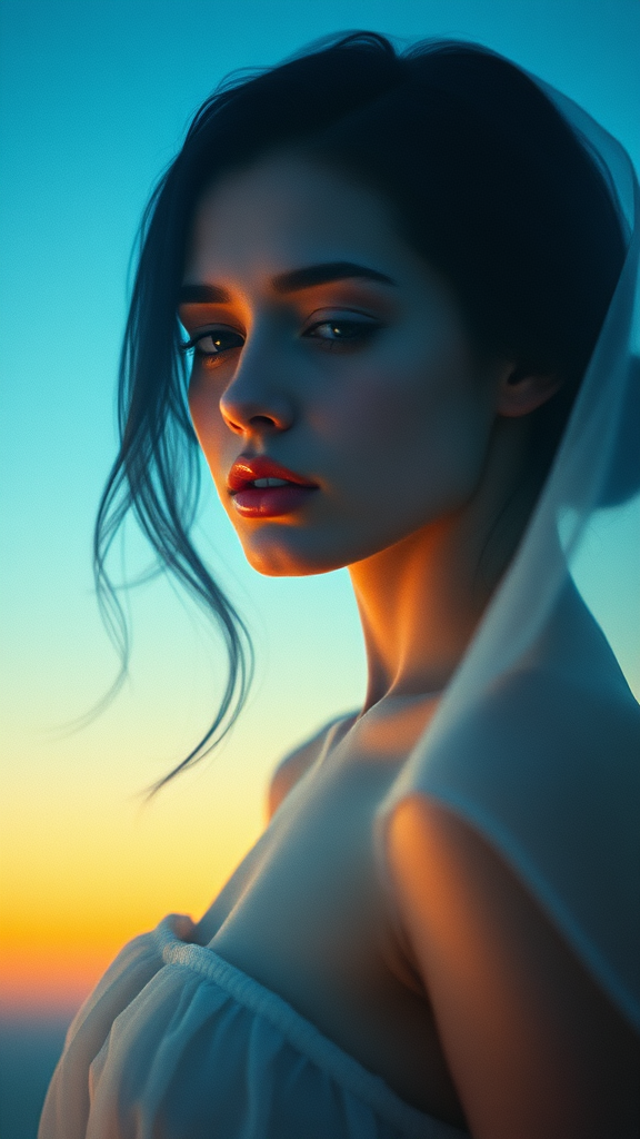 Dreamy minimal art in 35mm film style, featuring a flawless female figure under a surreal blue and orange color palette, capturing an ethereal and timeless essence.