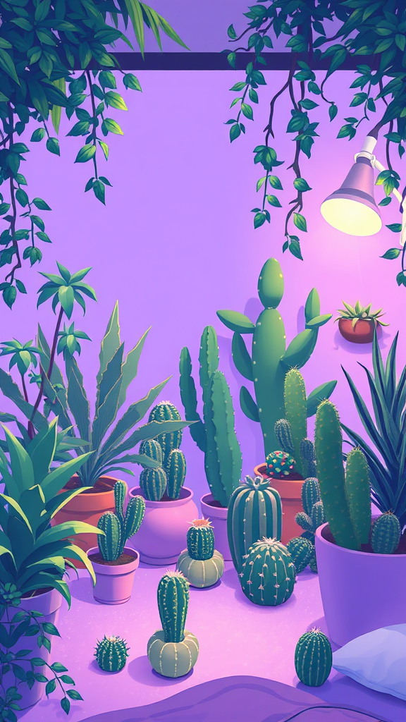 Dreamy nighttime sanctuary, styled in anime flair with lush greenery and whimsical plants. A collection of charming cacti adds character amidst gentle purple hues, casting a soft glow. The ambiance feels enchanting, combining cuteness and comfort for the perfect cozy atmosphere.
