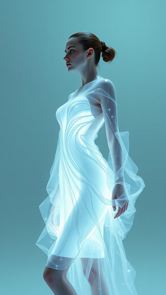 A luminous dress by hiveart electronic fashion, captured in a photoshoot, designed in cinema4d style, featuring hues of white and cyan with fluid, abstract anatomy. Inspired by Syd Mead and Anastasiya Dobrovolskaya, it boasts ultra-fine detail in an 8k 3D rendering, with an elongated aspect ratio.