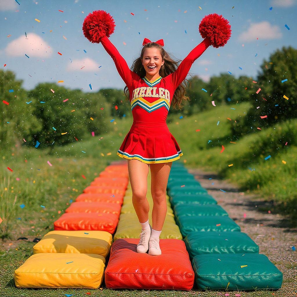 Dressed in a vibrant cheerleader outfit, standing triumphantly on a row of cushioned, colorful stepping stones as confetti rains down around her in a festive atmosphere.