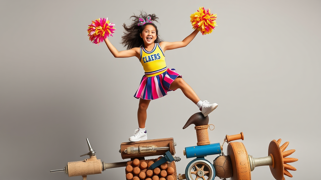 Dressed in a vibrant cheerleader outfit, balancing atop a series of mismatched objects, she radiates enthusiasm and energy. Her pom-poms flutter with each movement, adding to the lively spectacle.