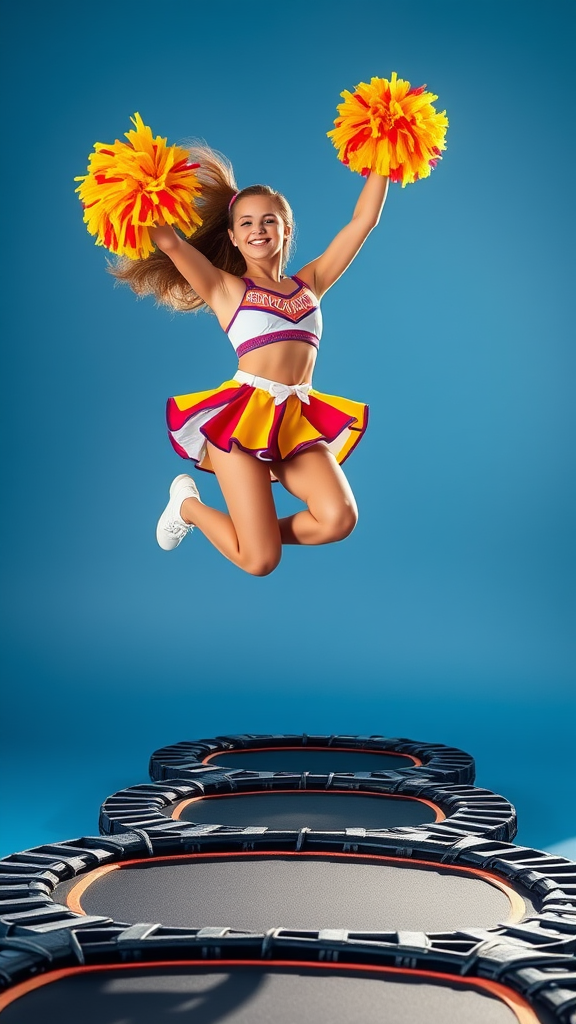 Dressed in a vibrant cheerleader outfit, standing on a series of bouncing trampolines that propel her into the air with a graceful rhythm, her pom-poms catching bursts of sunlight as she soars with each leap.