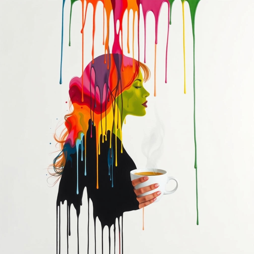 Dripping paint cascades over the silhouette of a woman, vibrant colors merging in an intricate dance, as she savors a moment with a steaming cup of coffee; the liquid artistry contrasts beautifully with her serene expression and the crisp, white background envelops the composition in clarity and focus.