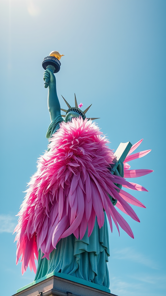 Drone photograph capturing the Statue of Liberty adorned in a luxurious pink feathered cape, set against a vibrant blue sky, 8k rendering, high-resolution hyperrealism, meticulously detailed, ultra-realistic, commercial-grade photography, expertly crafted color grading, emphasis on texture and contrast with an aspect ratio of 4:5.