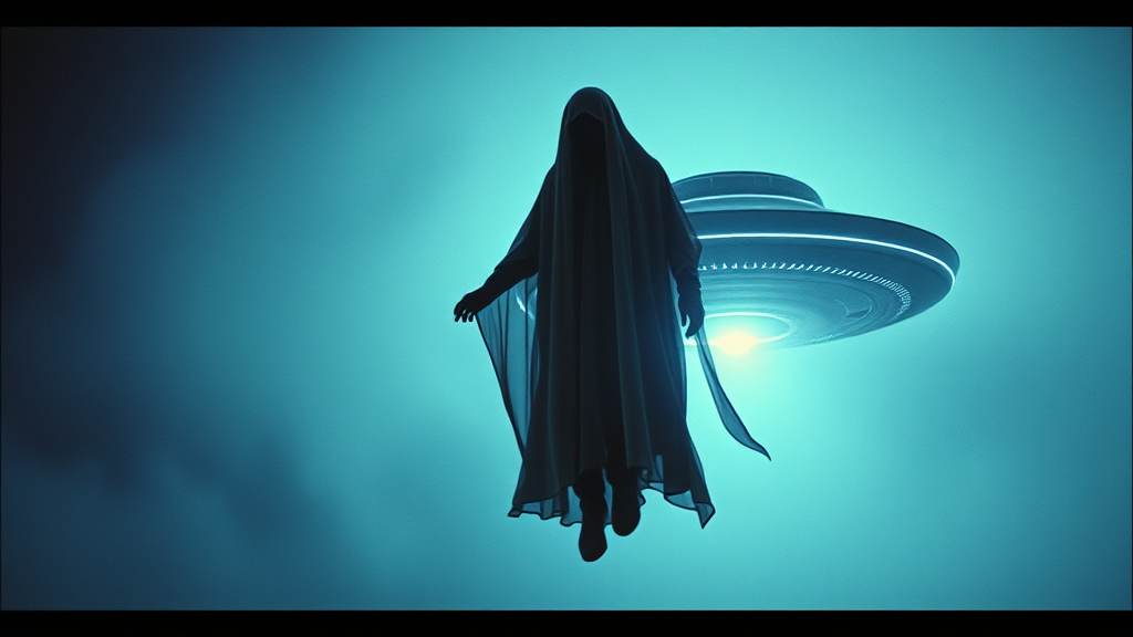 DVD screengrab, 1988 sci-fi movie vibe, genuine 35mm film texture, live-action scene featuring a shadowy futuristic ghost floating near a mysterious UFO, conveying a sense of timelessness and the pursuit of knowledge, captured with Hasselblad H6D-100c, XCD 85mm f/1.8 lens, maintaining a raw and authentic aesthetic with high chaos, 3:4 aspect ratio, enhanced style with a touch of creative flair, stylize 1000.