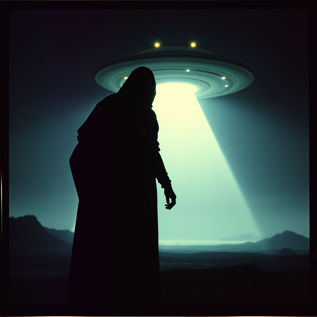 DVD screengrab from a 1988 sci-fi film featuring authentic 35mm film grain, capturing a live-action scene of a futuristic ghost silhouetted in black against the backdrop of a UFO, evoking a sense of timelessness and the quest for knowledge, shot with a Hasselblad H6D-100c using an XCD 85mm f/1.8 lens, infused with chaos and stylized raw aesthetics, profile reference 5irq8vw, with a high stylization factor of 1000, version 6.1.