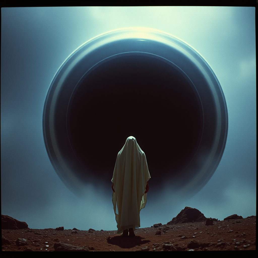 DVD screengrab from a 1988 sci-fi film featuring a live-action scene with a futuristic ghostly figure contrasted against a completely blacked-out UFO, evoking a sense of timelessness and the quest for knowledge. Captured with the distinct charm of authentic 35mm film grain, the composition is reminiscent of Hasselblad H6D-100c photography using an XCD 85mm f/1.8 lens, showcasing a rich, raw style with an emphasis on chaos, mysterious ambiance, and stylized elements that enrich the visual narrative.