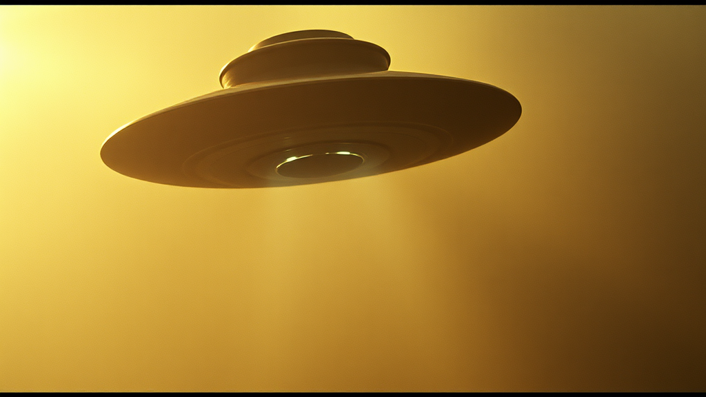 DVD screengrab from a 1988 sci-fi film, showcasing authentic 35mm film grain. Features a live-action scene with a futuristic, shadowy UFO hovering overhead, embodying a sense of timelessness and the quest for knowledge. Captured with a Hasselblad H6D-100c, using an XCD 85mm f/1.8 lens. The scene is infused with high chaos elements, maintaining a 3:4 aspect ratio, rendered in raw style, profile 5irq8vw with a stylized intensity of 1000, version 6.1.