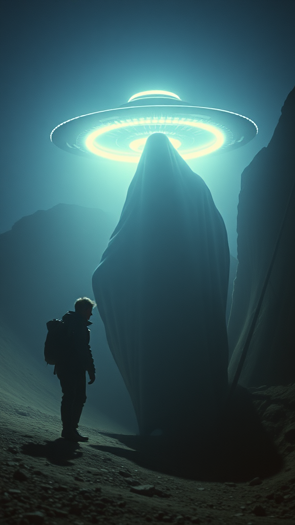 DVD screengrab of a 1988 sci-fi film featuring authentic 35mm film grain, showcasing a live-action scene with a futuristic, shadowy ghostlike UFO embodying a sense of timelessness and the quest for knowledge, captured using a Hasselblad H6D-100c with an XCD 85mm f/1.8 lens, channeling a raw, chaotic aesthetic, aspect ratio of 3:4, style profile 5irq8vw, heightened stylization at 1000, invoking the era while allowing for artistic variations to emphasize the mysterious journey and enigmatic atmosphere.