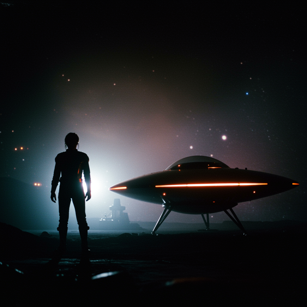 DVD still, 1988 science fiction movie, genuine 35mm film texture, live action featuring a shadowy futuristic apparition beside a sleek UFO, capturing timelessness and the quest for enlightenment; shot with a Hasselblad H6D-100c, XCD 85mm f/1.8 lens, infusing an atmosphere of raw style and a vibrant touch of chaos, evoking a sense of wonder and mystery.