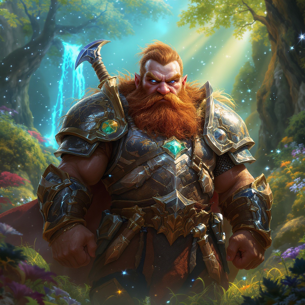 A stout dwarf warrior stands resolute, his eyes sharp and unwavering, surrounded by a lush, vibrant landscape that bursts with bright colors. Every detail is captured with cinematic clarity and a dreamy glow that adds a touch of magic to the scene. The atmosphere is steeped in fantastic realism, with dynamic elements that suggest movement and energy. Fairy-like lighting dances around him, casting soft, volumetric rays that illuminate his polished armor in rich HDR quality, enhancing the epic aura of the moment as he readies himself for the adventurers that lay ahead.