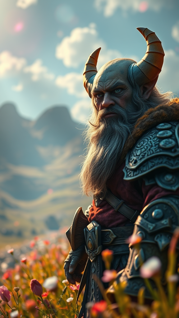 Dwarf warrior with an intense gaze, vibrant hues enveloping his intricately detailed armor, set amidst a vivid, dreamlike landscape. The scene is infused with a touch of cinematic flair, merging fantastic realism with a dynamic pose. Soft, ethereal lighting casts volumetric rays across the landscape, enhancing the HDR effect while fairy-like luminescence dances around, creating an otherworldly atmosphere.