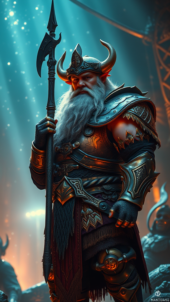 Dwarven warrior clad in ornate armor, standing tall with intense focus, vivid colors illuminating the scene, exquisitely detailed and cinematic in scope, surrounded by a dreamlike glow of ethereal beauty, with fantastical realism. The atmosphere is dynamic, pierced by mystical fairy-like lighting, enveloped in volumetric rays and enhanced by HDR, capturing the essence of an epic adventure.