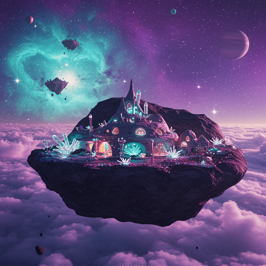 View this AI-generated image featuring a breathtaking dwelling sculpted within a massive asteroid floating serenely in the sky characterized by surrealist dreamlike qualities and ethereal beauty amid celestial wonders and cosmic landscapes. Created using advanced AI technology, this image showcases