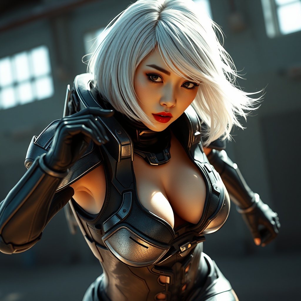 View this AI-generated image featuring dynamic action scene featuring a beautiful korean woman reminiscent of a k pop idol clad in sleek mass effect armor her striking white hair styled in a cute loose bob her red lips add a bold contrast to her focused expression with a toned physique and small bre