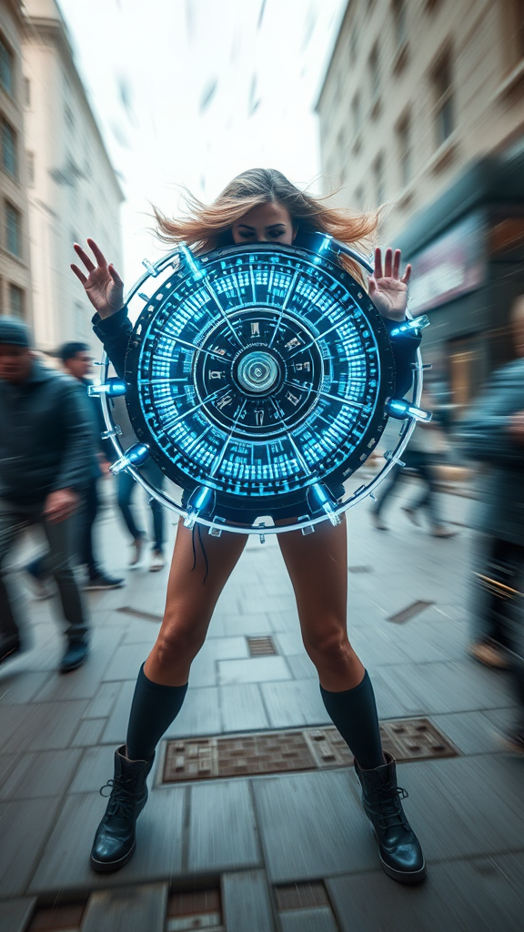 Dynamic and exhilarating, a British hero armed with her time-bending Chronal Accelerator, a central circular device pulsating with ethereal blue energy, stands poised for action. This intricate mechanism boasts a network of glowing circuitry, empowering her to blink through moments, recall past seconds, and deftly manipulate the flow of time itself. Amidst the action-packed scene, the chaotic blur captures her movement, as her limbs contort through space with a mesmerizing, albeit slightly distorted, grace. The full-length portrayal radiates realism, capturing both the power and unpredictability of her extraordinary abilities against the blurred backdrop of a world in flux.