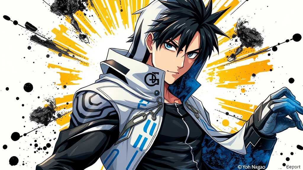 Dynamic anime poster featuring a male character cloaked in sleek black, white, and blue attire, showcasing Yoh Nagao's signature style with intricate patterns and textures. The background bursts with a vibrant light-focused ink splash, creating a sense of motion and energy. The character's determined expression and dynamic pose highlight his strength and charisma, while subtle accents of metallic silver weave through the design, adding an extra layer of depth and intrigue to the overall composition.