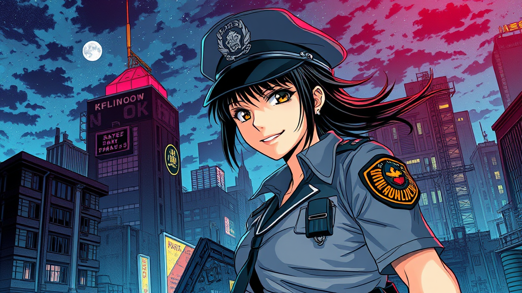 dynamic female officer dystopian Japanese metropolis dramatic night sky manga style highly detailed intricate line work cell shading graphic novel aesthetic digital painting vivid colors inspired by Masamune Shirow character design essence infused with a twist reminiscent of Hajime Shimomura --creative enhancements on character attire and cityscape ambiance maintaining core themes