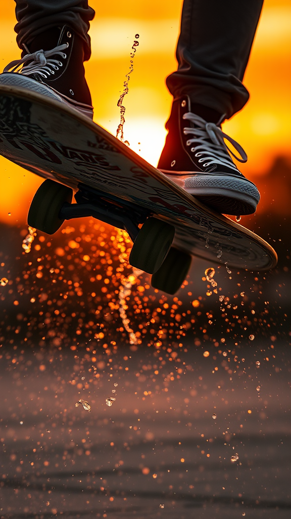 Dynamic high-speed action captured in high-resolution photography, set against a warm, vibrant sunset backdrop. An intense focus on the airborne skateboard and the soles of shoes, amidst a dance of water droplets, highlighting brisk movement and subtle details like water splashing and texture contrasts. Shot with a Nikon D850 for its fast shutter speeds and high dynamic range, which preserves the rich sunset hues and details in both highlights and shadows, using a Nikon AF-S NIKKOR 70-200mm f/2.8E FL ED VR lens chosen for its sharpness and ability to freeze fast action with a creamy bokeh that isolates the subject. A high-speed burst mode with a fast shutter of 1/4000 sec is employed to freeze the droplets, and a low ISO is used to minimize noise. The skateboard's dynamic underbelly is adorned with gritty street art stickers, and the skater's black Vans Old School high-top sneakers are mid-flip, with laces tied tightly for secure footwork, gripping the board's edge. The grip tape on the board's surface shows wear from many rides in an urban playground, likely a skate park or rain-slicked street, where reflective puddles mirror the fiery sky. The ground glistens with recent rain, and in the background, silhouettes of city structures stand against the gradient of the sunset. The sun's dying light casts everything in a rich amber, with silhouettes sharply defined and water droplets glittering like jewels in the air. Every splash and ripple, the texture of the skateboard's underside, the treads of the sneakers, and the distant clouds sing with clarity, creating a high-contrast, vibrant end-of-day street scene where nature's beauty meets the raw energy of street sports, all heightened by the dramatic lighting of dusk. UHD, many details.