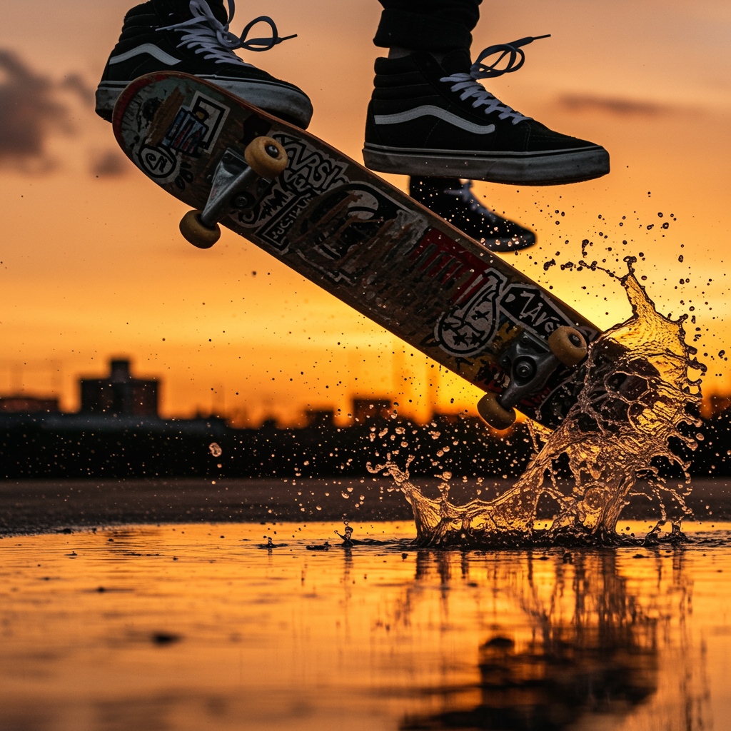 Dynamic high-speed action comes alive against a warm, vibrant sunset backdrop. A tight crop captures the airborne skateboard and the soles of shoes amidst a dance of water droplets. High-resolution photography brilliantly captures brisk movement and subtle details like splashing water and texture contrasts. Utilizing a Nikon D850 for its fast shutter speeds and high dynamic range to preserve rich sunset hues and detail in both highlights and shadows, paired with a Nikon AF-S NIKKOR 70-200mm f/2.8E FL ED VR lens known for its sharpness and creamy bokeh that isolates the subject. Employing high-speed burst mode with a fast shutter of 1/4000 sec to freeze the droplets and a low ISO to minimize noise. Featured is the dynamic underbelly of a skateboard adorned with gritty street art stickers and the skater's shoes, mid-flip, black Vans Old Skool high-top sneakers with tightly tied laces securing footwork and gripping the board's edge, while the grip tape on the board shows wear from countless rides. The scene set in an urban playground, perhaps a skate park or rain-slicked street where reflective puddles mirror the fiery sky. The ground glistens from recent rain, silhouettes of city structures cutting sharply against the sunset's gradient. The sun's dying light bathes everything in rich amber, casting sharply defined silhouettes and causing water droplets to glitter like jewels in the air. Every splash and ripple sing with clarity, showcasing the texture of the skateboard's underside, the sneakers' treads, and distant clouds. A high-contrast, vibrant end-of-day street scene where nature's beauty meets the street sport’s raw energy, accentuated by the dramatic dusk lighting, capturing a vivid UHD moment of energy and color where high details come alive.