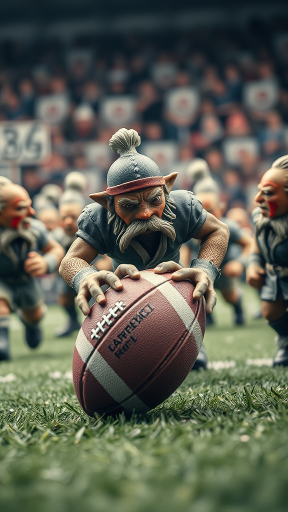 Dynamic photograph of a fantasy football playfield featuring orks and dwarfs, captured at 1000mm f/1.2, showcasing highly detailed skin textures. This full-body shot highlights a rugby ball, with a focus on the unique and vivid characteristics of the scene. The setting includes a blend of monochrome and pastel tones, creating low contrast, giving an ethereal and dreamlike quality. The figures have a touch of artistic flair with unusual proportions and bold shading, paired with a creative use of blur to suggest movement, while emphasizing the imperfect charm of handmade figurines with a nostalgic, vintage aesthetic. The image is presented with a dynamic, yet whimsical atmosphere amidst a backdrop of jelly bag cap designs, enhancing the fantastical elements of the scene.