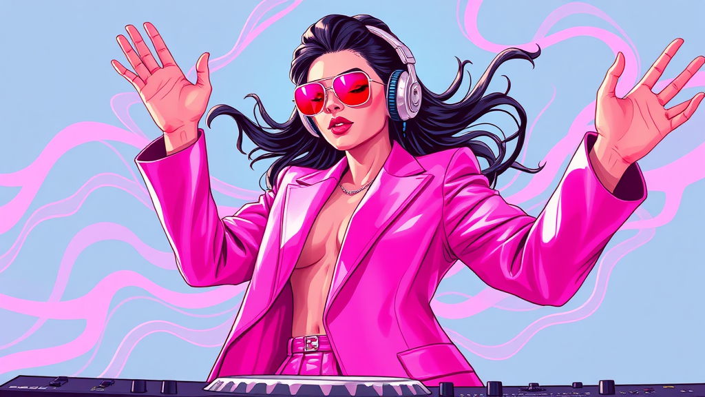Dynamic portrait of DJ Chickie, clad in a vibrant pink suit, immersed in her tunes, styled as energetic animated gifs with a happycore vibe. Her feminine form flows like liquid metal, embodying wavy motions with a video-like fluidity, infused with a touch of pigeoncore essence.