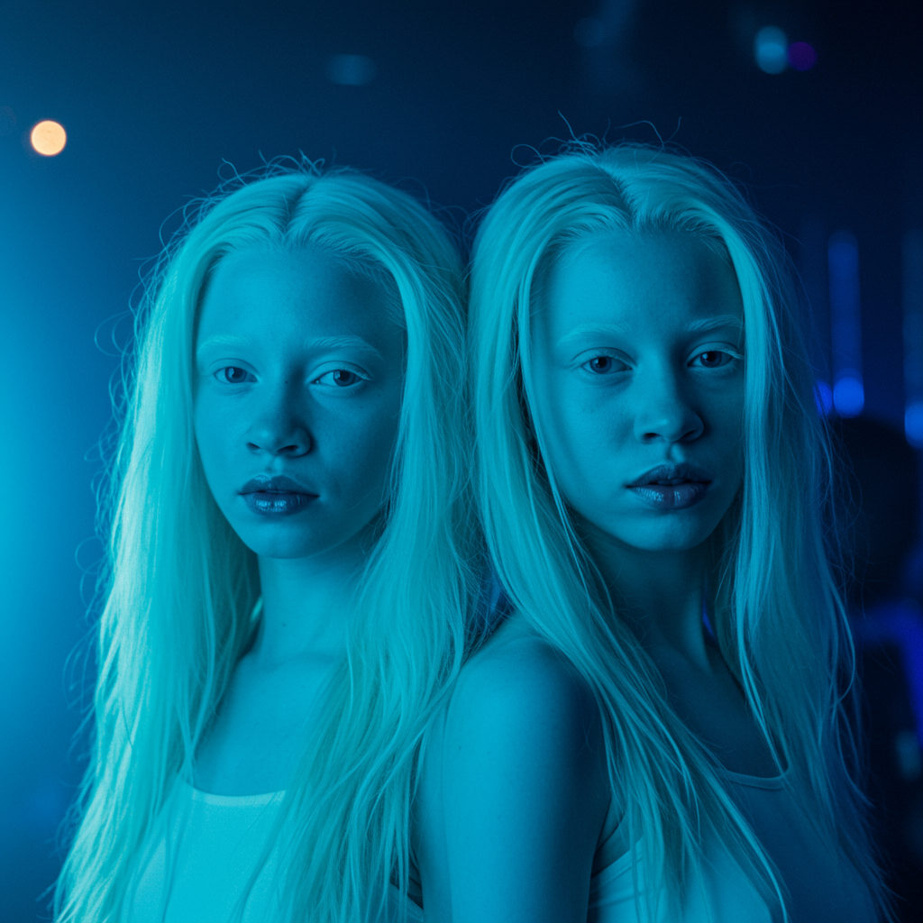 Dynamic portrait of two albino twin sisters illuminated by cool blue lighting in a night club setting, showcasing a mix of volumetric and back-shining light effects. With a cinematic angle capturing the glamour and vibrance, the high-resolution and realistic photograph emphasizes the ethereal bokeh background, while the sisters' unique features are highlighted by the interplay of dynamic light and shadows.
