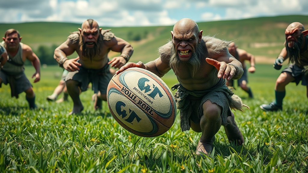 Dynamic realistic photograph of a fantasy football playfield featuring orcs and dwarfs, with highly detailed skin textures, captured in a full-body shot. The scene includes a rugby ball with unique designs, emphasizing a mix of natural and fantastical elements. Vibrant colors and high contrast enhance the visual appeal, moving away from monochrome and faded tones. The characters are depicted with intricate hand details and proportional bodies, ensuring realism. A mystical atmosphere is created with a backdrop of vivid green fields, under a clear sky, adding a touch of fantasy and adventure to the dynamic scene.
