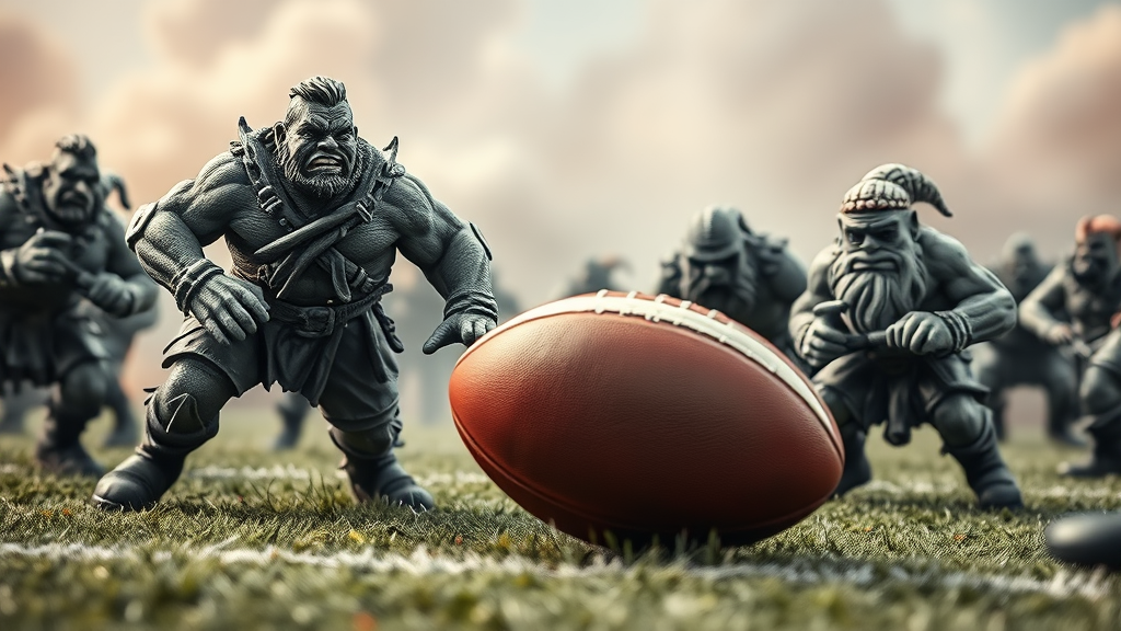 Dynamic realistic photograph of a fantasy football playfield featuring orks and dwarfs, captured with 1000mm f/1.2 lens, showcasing highly detailed skin texture and full body shot. The scene includes a rugged rugby ball amidst fierce action. The miniatures are captured with vivid detail, while the monochrome setting enhances contrast and atmosphere. With exaggerated features and dramatic proportions, the characters embody the intensity of the game. The background features a burst of faded pastel colors, adding to the surreal yet engaging environment. The photograph is slightly out of focus at the edges to create depth, capturing the raw energy and excitement of the fantasy sport.