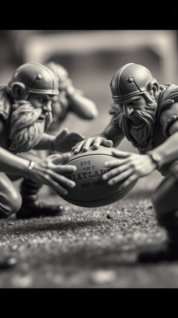 Dynamic realistic photograph of a fantasy football playfield featuring orks and dwarfs, captured with a 1000mm f/1.2 lens; showcasing highly detailed skin textures in a full body shot as they compete over a rugby ball. The figurines, reminiscent of miniatures, possess unique artistic flaws, including fused fingers and disproportionate hands. The scene is presented in monochrome with a faded, pastel color palette, resulting in a low contrast, slightly blurry depiction. They wear jelly bag caps, adding an intriguing element to an otherwise traditionally uninspired tabletop setting.