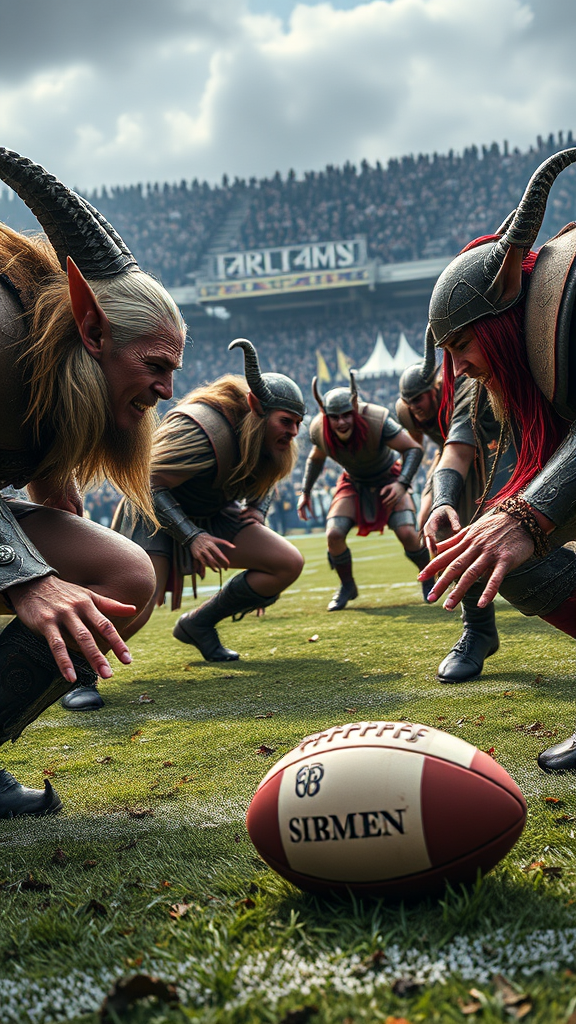 Dynamic realistic photograph of a fantasy football playfield featuring elves and orcs. Captured using a 1000mm f/1.2 lens, the image highlights highly detailed skin textures in a full-body shot. Elves and orcs showcase intricate armor and expressive faces, with an emphasis on vivid colors and movement. On the field, a rugby ball lies in play, while the setting exudes an atmosphere of intense competition and energy. The scene is richly detailed with realistic lighting and shadow, avoiding any sense of artificiality or uninspired composition. The fantasy football setting is brought to life with a focus on vibrant contrast and dynamic interaction between the characters.