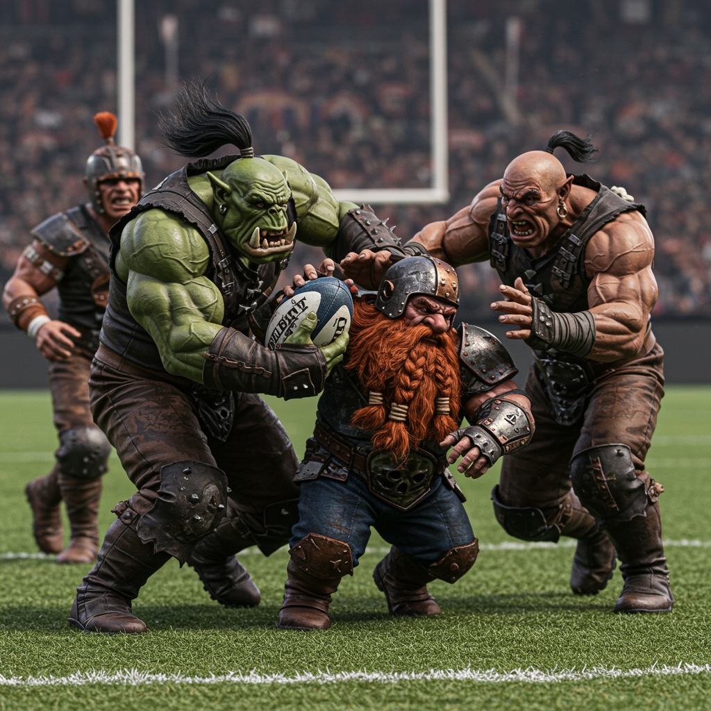 Dynamic realistic photograph of a fantasy football playfield featuring orks and dwarfs, showcasing highly detailed skin textures in a full body shot. The scene captures the intensity and movement on the field with a focus on intricate details and vibrant colors. The players are locked in a fierce battle over a rugby ball, their muscular physiques and expressions exuding determination. The playfield is alive with energy, bringing the fantasy theme to life with rich contrasts and sharp focus. The composition embraces creativity and imagination, highlighting exceptional artistry and attention to proportion. In the background, the atmosphere is filled with a mix of excitement and tension, complemented by the intricate textures of the players’ uniforms and gear.