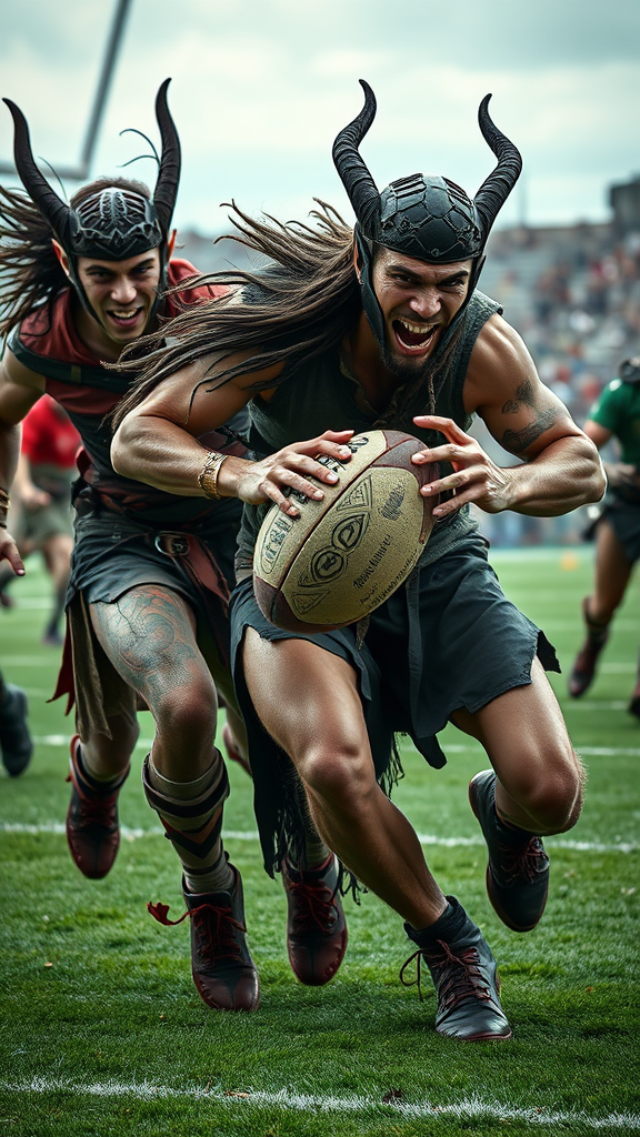 Dynamic realistic photograph on a fantasy football playfield featuring elves and orcs, captured with a 1000mm f/1.2 lens for highly detailed skin texture. The scene is a full-body shot showcasing a vibrant, action-filled moment with uniquely styled, vivid colors and sharp details. The characters exhibit a mix of mythical and athletic elements, carrying a rugby ball with intricate designs. There is a sense of fluidity and motion as these fantastical beings engage in a spirited game, with their expressive features and muscular physiques expertly depicted. The photography focuses on highlighting their dynamic poses and intricate costumes, set against a vibrant and rich background.
