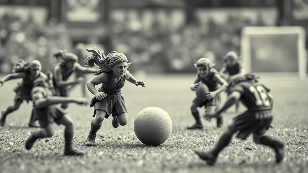 Dynamic realistic photograph on a fantasy football playfield featuring elves and orcs, captured with a 1000mm f/1.2 lens for highly detailed skin texture, depicted in a full body shot. The scene includes elements like a plastic-looking rugby ball and miniature figurines, conveying a tabletop game atmosphere. The composition plays with monochrome tones, fused fingers, and slightly off proportions for a whimsical touch. The overall image has a faded and pastel appearance with intentionally low contrast and slight blur, and characters are humorously adorned with jelly bag caps to add a unique flair.