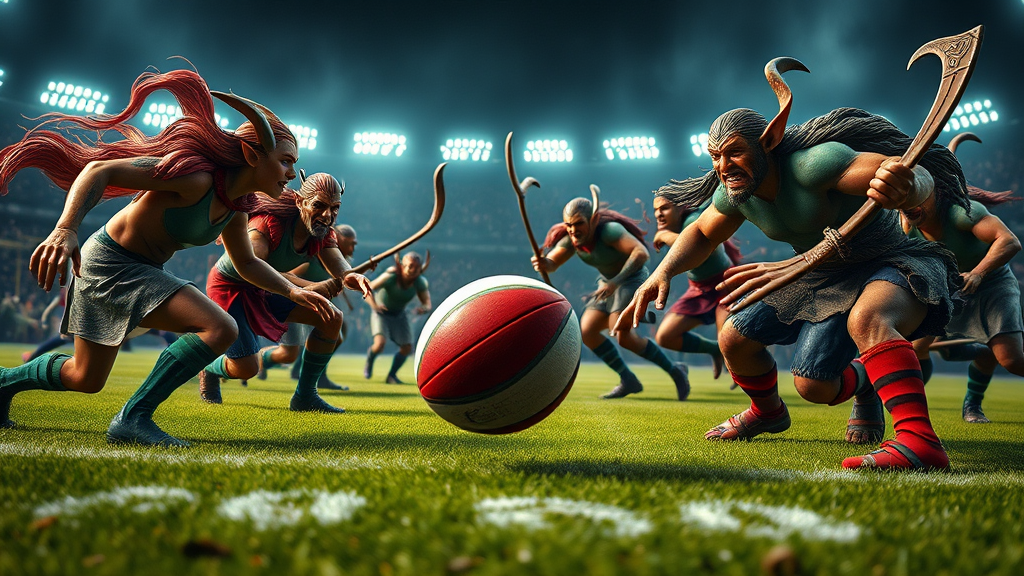 Dynamic realistic photograph on a fantasy football field featuring elves and orcs, captured with a 1000mm f/1.2 lens, showcasing highly detailed skin textures in a full body shot. The scene centers on an epic rugby-style game with a uniquely designed ball, emphasizing vibrant colors and dynamic poses. The figures are crafted with intricate attention to detail, avoiding any notion of a plastic figurine aesthetic. The characters are richly defined, with natural hand and finger positions, and proportional bodies that radiate energy. The atmosphere is vivid and sharp, contrasting against a mystical backdrop, capturing the intensity of the match without the monochrome or faded effect. The setting comes alive, leaving behind the sense of uninspiration usually found in poorly drawn tabletop miniatures.